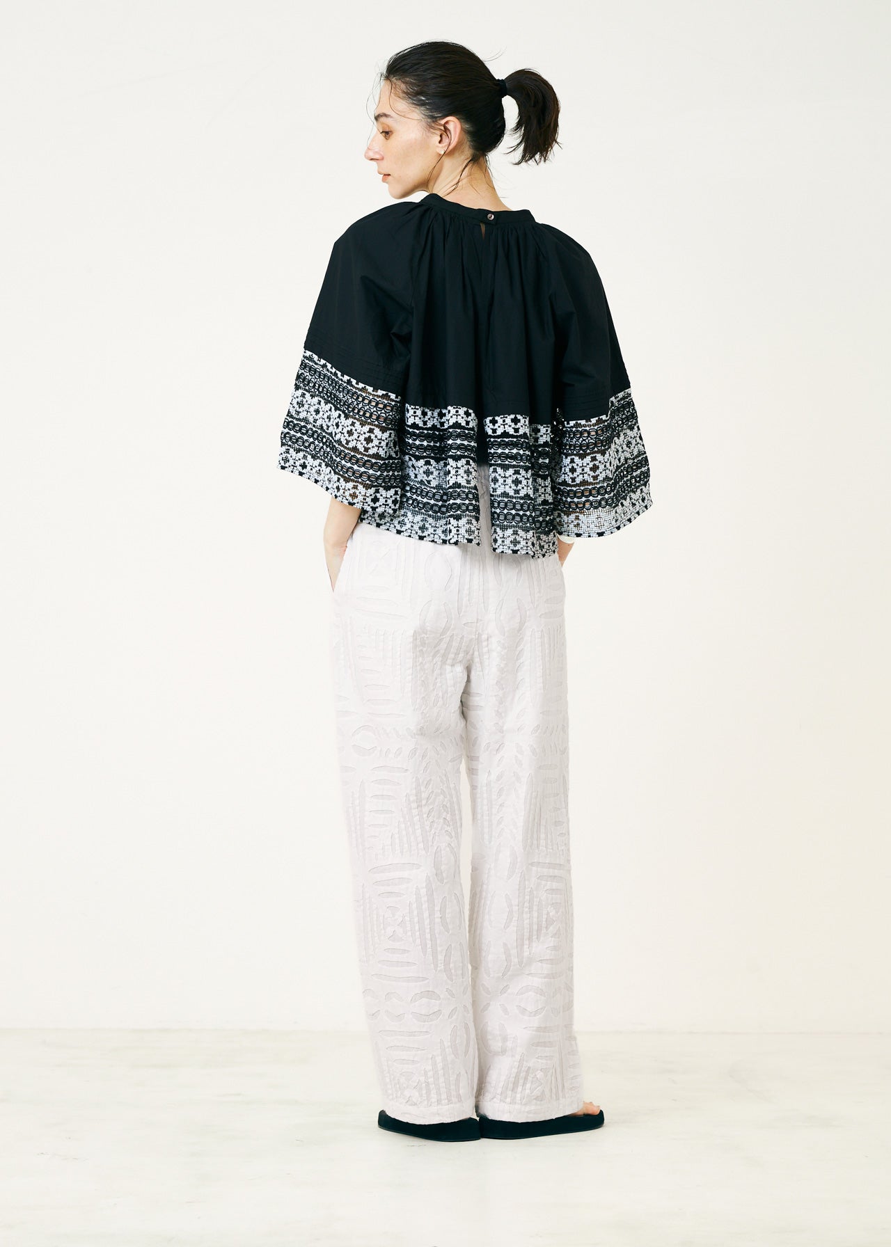 コットンを二重に重ね、アップリケを施した上品な印象のパンツ。